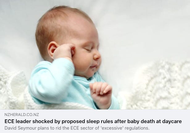 That was all pretty awful, but the story that stuck with me was about David Seymour's proposal to reduce safety standards for babies in childcare. I posted:
