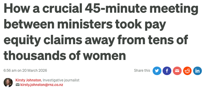 Speaking of things that are disgraceful, it emerged this week that when Brooke van Velden and others discussed whether to cancel fair pay agreements for women, they spent less than an hour on it before agreeing to do so.