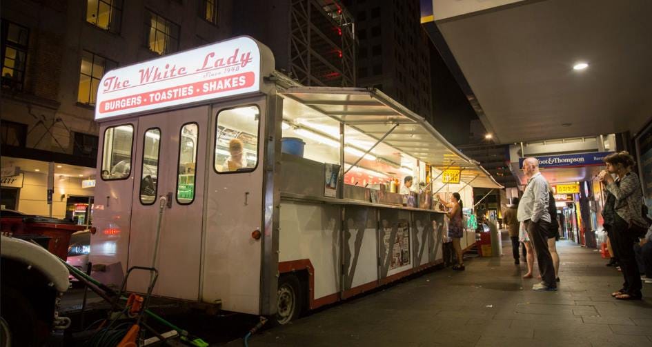 Seven years ago, I posted: “Great to see recognition on TV tonight of 70 years of the White Lady. So many nights chatting and smoking with folks who had come from the same bar or gig, waiting for orders. At the end of the evening, that first juicy bite in the passenger seat as you slurred your address to the taxi driver. Classic Auckland Icon.”