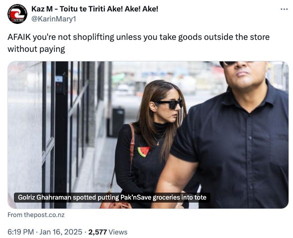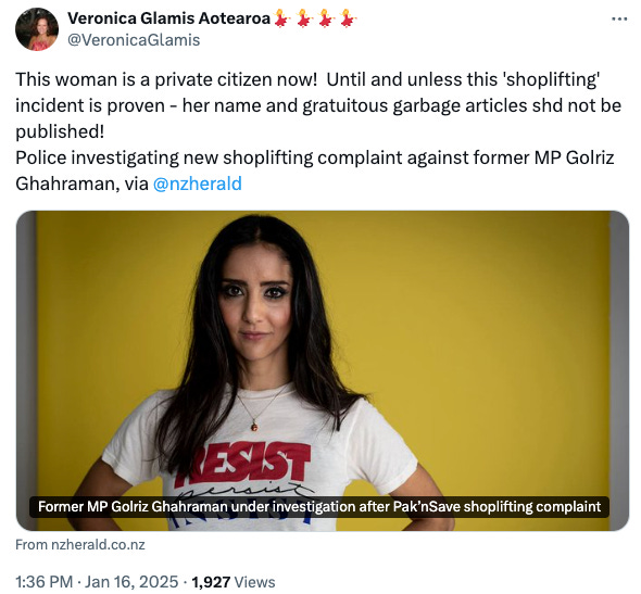 In yesterday’s newsletter, I expressed sadness at seeing Golriz Ghahraman back on the front pages for shoplifting.