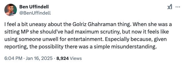 But I’m a middle-aged white bloke, right, and not someone with a shoplifting record. So is that what we’re doing? Splashing Golriz’s name over the papers because of her past deeds and/or her demographics? The same demographics that made her such a target for online abuse?