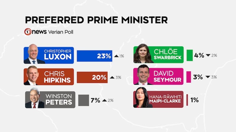 There were no major losers or winners other than NZ First, which was up 2% to 7%, and Winston Peters, as preferred PM, also up 2% to 7%.