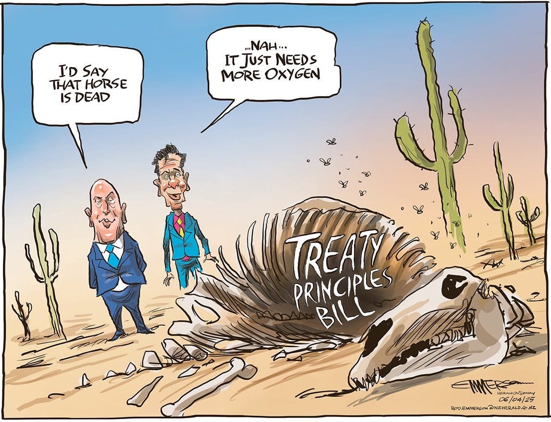 Perhaps we should also spare a thought for ACT; it must be a hard week for them, with their attempt to dishonour the Treaty so resoundingly rejected and their bill being euthanised.