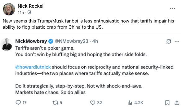 Anyone with half a brain can see that nothing of the sort happened. We’re paying the same percentage as other countries like us; the rate is based on our trade balance and has nothing to do with the imagined charms of the coalition.