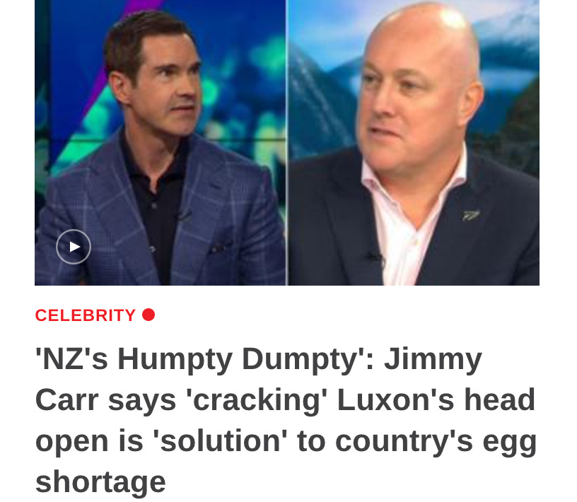 Someone commented “Um... is it ok to imply violence against Luxon, then criticise those who do the same to Ardern?” I replied that “I don’t think Jimmy Carr making a joke about a bald man having an egg shaped head at a time when there is an egg shortage is seriously implying violence.” Yet there was a point worth discussing.