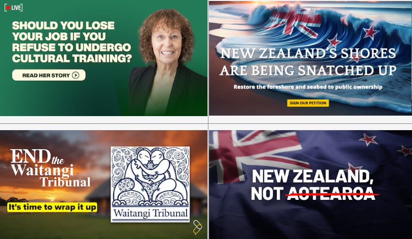In addition to their campaign to remove Māori Wards, ensuring Māori don’t get a seat at the white man’s table, Hobson’s Pledge are running four main campaigns at present (clockwise from the top left in the following image):