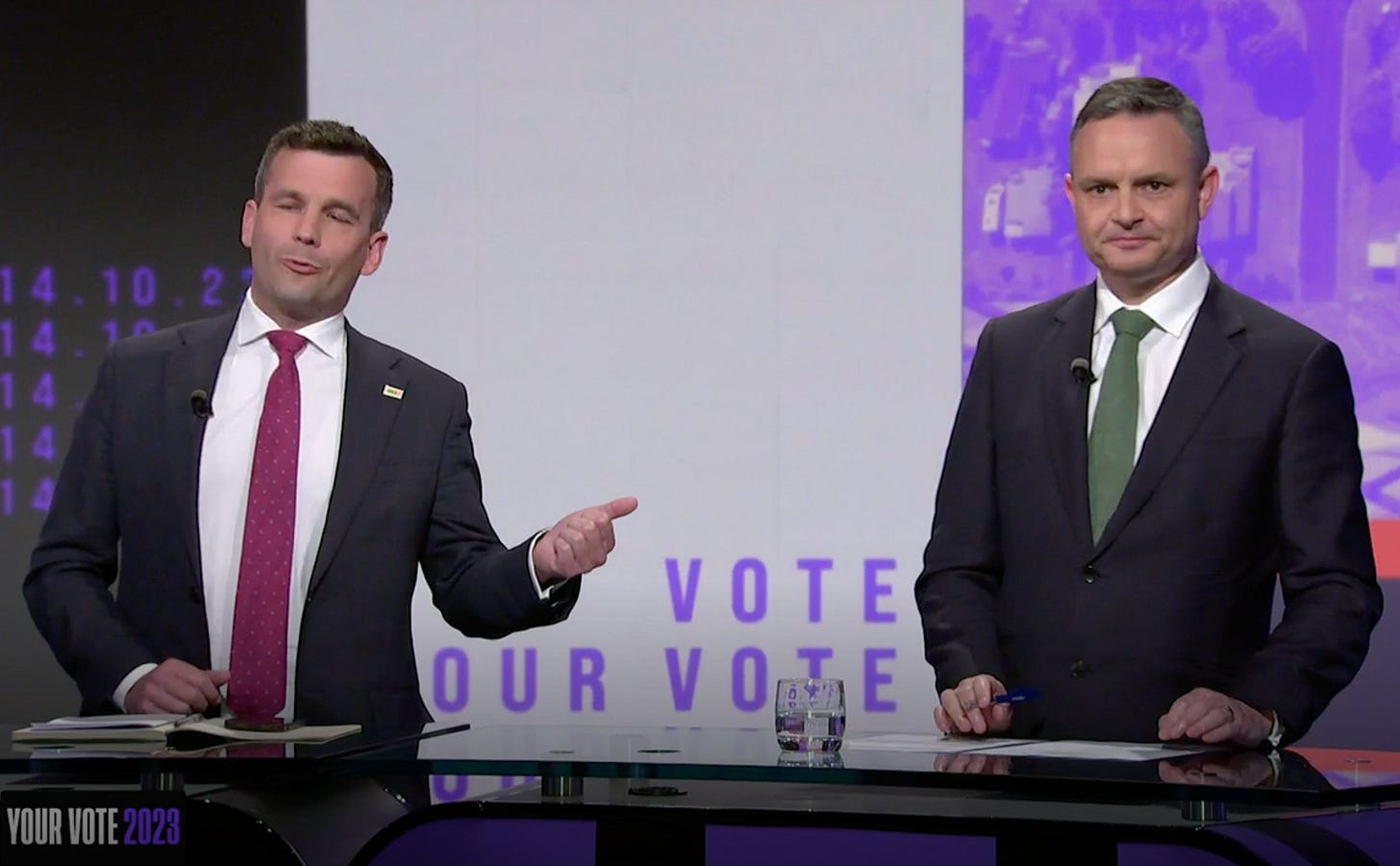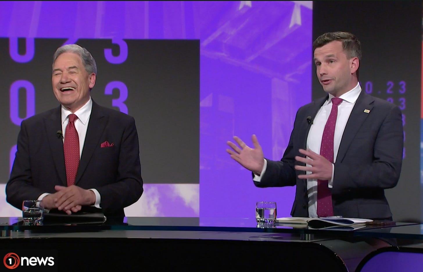 At least the audience looked a little more alive than that one, although ugh - there was the Newstalk ZB village idiot in the front row. Still at least Jason didn’t get to ask any of his notoriously stupid questions here. Speaking of a bit more life - this time they placed Winston and David in the centre, right beside each other.