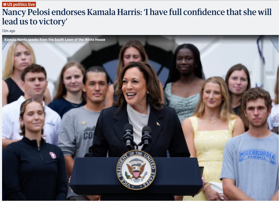Key financial backers are largely lining up behind Harris, and as I’m writing this news has just come out that Nancy Pelosi, a hugely influential figure in the Democrat party, has announced her support for Kamala.