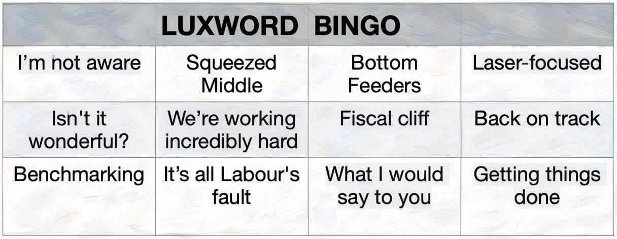 I wasn’t feeling optimistic that Jack would make the exercise more useful than recent efforts from his kitty cat colleagues at TVNZ. I prepared a Buzzword Bingo card to keep things interesting, just in case.