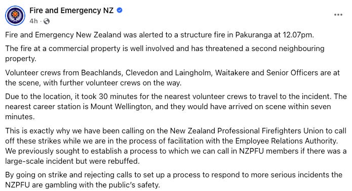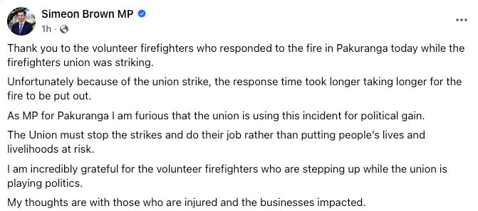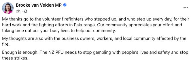 While this fire is absolutely awful, it's appalling by both Simeon Brown and Brooke van Velden to come out on social media and express their anger considering this government and FENZ won't pay our firefighters or provide adequate equitment and resources.