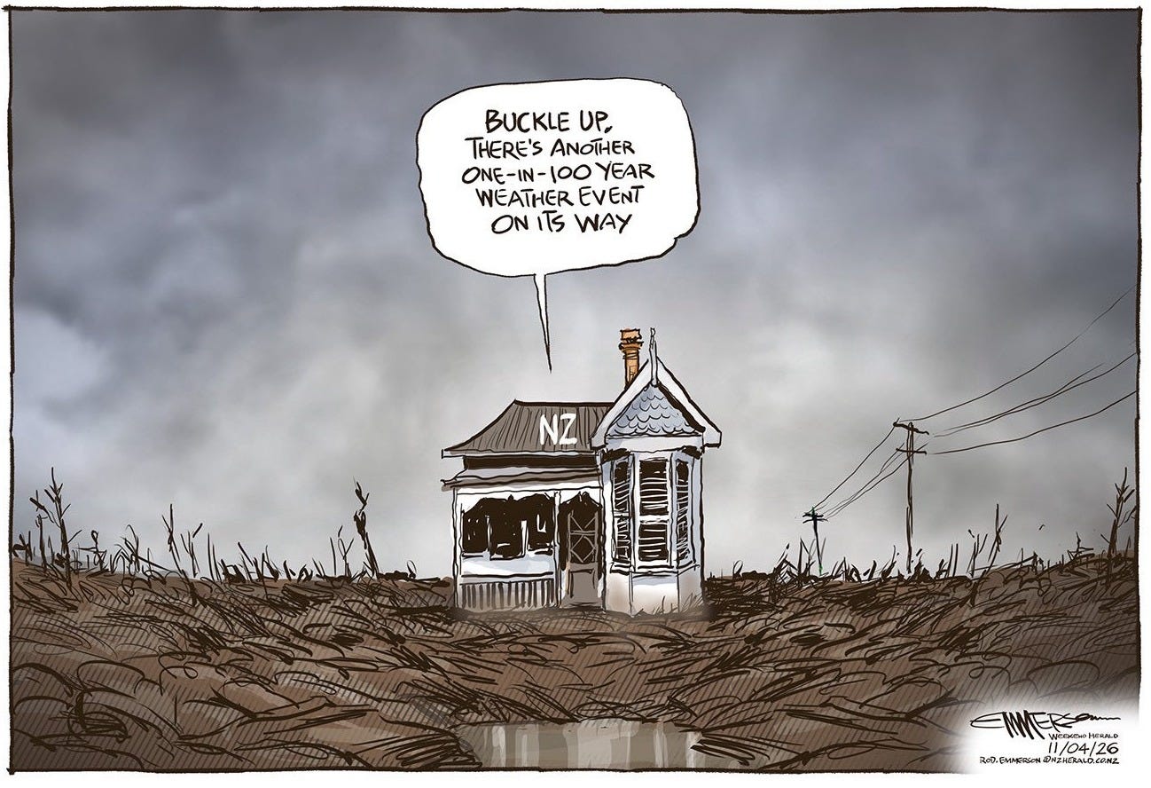 Luxon said we’re getting better at responding to such events, and I have to say, seeing images of army trucks in the BOP on the news last night, I was glad to see them being proactive, but it’s still the bottom of the cliff. Our housing and infrastructure planning needs to reflect our new reality, but the coalition's main focus in those areas has been to stop housing intensification in Auckland's wealthier suburbs.