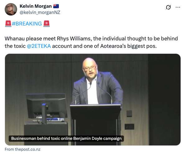 A paywalled article in the Post: Businessman behind toxic online Benjamin Doyle campaign covers Williams’ use of the Twitter account @2ETEKA, which “has called for more dirt on Doyle and relentlessly targeted political opponents with slurs, smears, and thinly veiled allegations of paedophilia.”