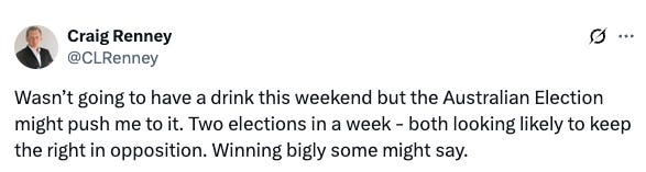 It was not looking good for Mr Dutton from the get-go, and about an hour after the results started coming through, I shared an update: “Jane Hume has denied reports she has been ringing parliamentary colleagues to discuss the Liberal leadership post-election, saying she was just offering ‘pastoral care’.” Saying, “Gee, that's a bit early.”
