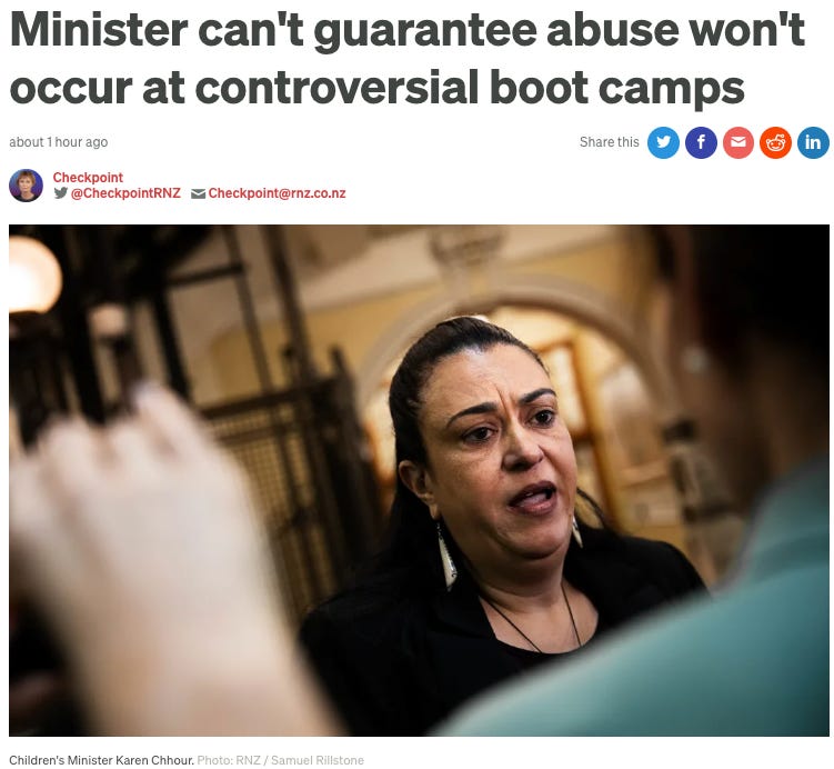 Minister Chhour was asked on RNZ if she could guarantee that young people in boot camps would not be at risk of abuse. She said she couldn’t. How’s that for ministerial responsibility? The Minister for Children says she can’t guarantee that young people her government are putting into state care facilities won’t be abused.