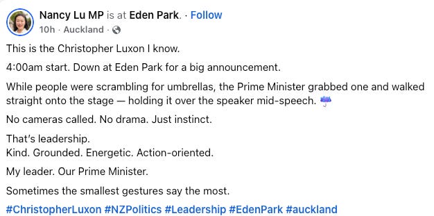 Trisha wrote, “Look, what I would say to you, Bottom Feeder, is that PM Luxon is a Sports Promoter, a Concert Entrepreneur and a Salesman. He cannot possibly risk getting his feet wet!”