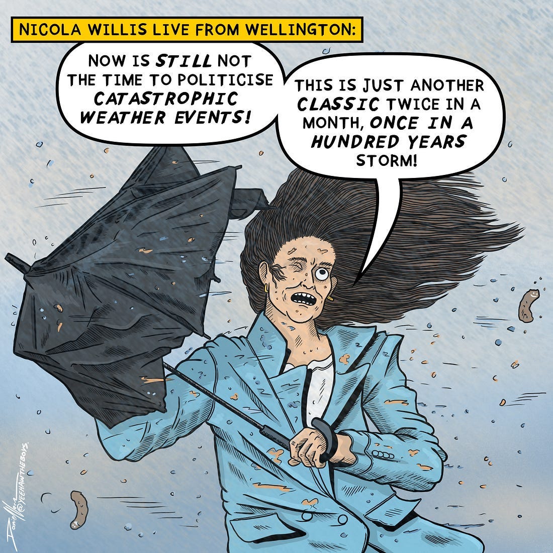 "How wonderful to have a Prime Minister who understands that when the country is flooded because of climate change, the roads are blocked because we denuded the hills of native trees, and the foreshore in Wellington is drowning in shit, the solution is to announce the holding of an incomprehensible Australian sporting fixture in which we are not involved is to be held in an Auckland stadium at the expense of the New Zealand taxpayer. The man's a hero!"