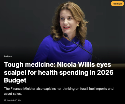 The paywalled article begins, “Finance Minister Nicola Willis is coming for the key budgetary part of Labour’s health reforms, with changes possible as soon as this year.”